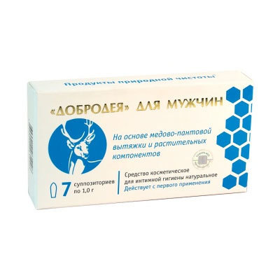 Суппозитории «Добродея» для мужчин — косметическое средство для интимной гигиены. Компоненты состава в комплексе способствуют предотвращению дегенеративных изменений предстательной железы, нарушения гормонального баланса, предупреждению опухолевых изменений мужских половых органов и половой слабости.