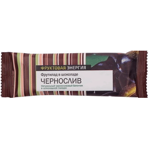 Батончик из чернослива, яблок. Без добавления злаков. Глазируется шоколадной глазурью. Классический вкус чернослива в шоколаде в удобной упаковке. Применение низкотемпературной сушки позволяют не добавлять в продукт ароматизаторов, вкусовых добавок и красителей. Готовятся без сахара, для регулировки сладости добавляется фруктоза.