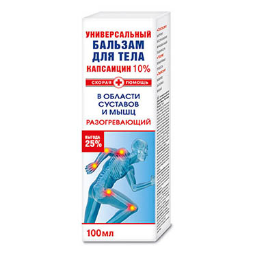 Бальзам для тела Скорая помощь с капсаицином поможет при болях в суставах и мышцах, при простуде и радикулитах. Обладает выраженным болеутоляющим и согревающим эффектом. Усиливает местное кровообращение, улучшает тканевый метаболизм в области суставов. Благодаря очень высокой способности проникать в ткани, стимулирует активное восстановление повреждённых и старых клеток сустава. Содержит большое количество органических компонентов цинка, которые оказывают антиоксидантное, противовоспалительное и иммуностимулирующее действие.