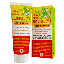 Крем-снадобье с Золотым усом, Сабельником и Медвежьим жиром облегчает состояние при боли в суставах. Снимает болевые ощущения в мышцах и суставах при отложении солей, улучшает подвижность суставов.