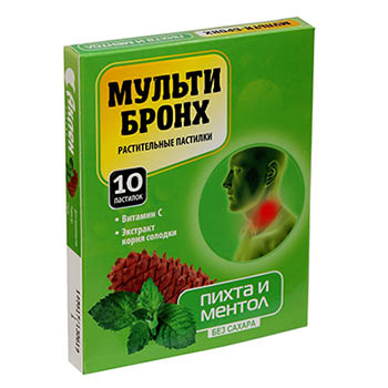 Мульти-Бронх — леденцы с противовоспалительным, спазмолитическим, отхаркивающим и обезболивающим действием. Действие леденцов обусловлено свойствами входящих в его состав компонентов: экстракт эвкалипта, экстракт мяты, масло пихты, масло шалфея, ментол. Применяются при кашле и заболеваниях горла.
