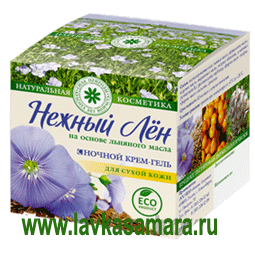 Крем-гель ночной «Нежный Лен» для сухой кожи восстанавливает барьерную функцию кожи, улучшает работу сальных желез, способствуя нормальной увлажненности кожи; питает кожу; улучшает метаболические и регенерационные функции клеток кожи; стимулирует синтез коллагена и эластина. Улучшает цвет лица, повышает тонус кожи, эластичность и упругость, укрепляет контуры лица, подтягивает кожу, способствуя уменьшению глубины и количества морщин.