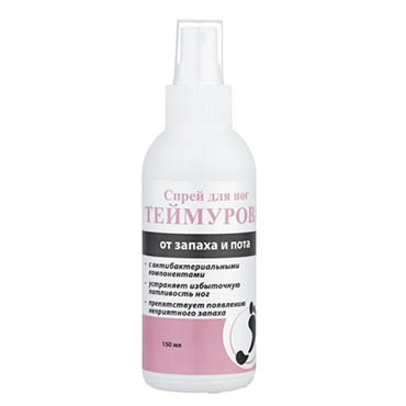 Спрей Теймурова рекомендован для ежедневного применения с целью устранения запаха и избыточной потливости ног, чему способствует комплекс активных компонентов: борная, салициловая кислоты, тетраборат натрия и метенамин.