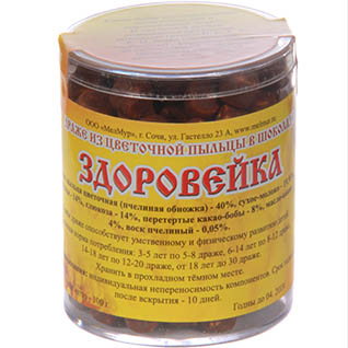 Медовые драже «Здоровейка» с шоколадом. Цветочная пыльца богата витаминами и микроэлементами, а сочетание с какао-бобами делает эти драже полезнейшим лакомством для любителей шоколада.