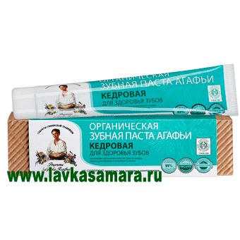 Органическая зубная паста Агафьи «Кедровая» для здоровья зубов на основе органического экстракта кедра, масла шиповника и пчелиного воска. Зубная паста эффективна при кровоточивости дёсен и предотвращении развития пародонтоза. При этом она бережно полирует эмаль зубов, возвращая ей блеск и естественную белизну. Природные ультра мелкозернистые абразивные компоненты способствуют эффективному и бережному удалению зубного налёта.